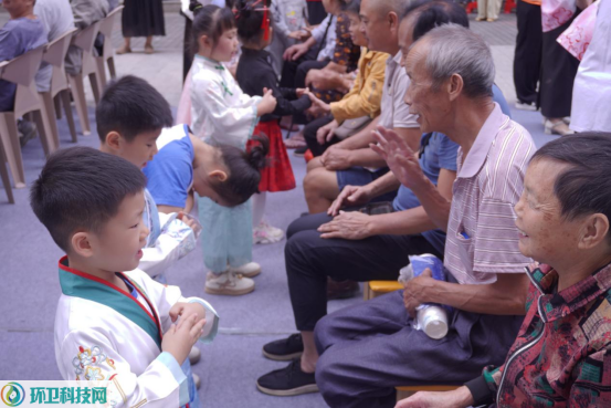活动现场,南靖县妇幼保健院及社区卫生院的医护人员为老人提供免费的健康检测服务,延续了南靖县长期以来对老年健康的关注。随后,国英幼儿园的孩子们表演了《中华孝道》手势舞和《当你老了》情景剧,用稚嫩而真挚的表演传递孝亲之情。在庄重温馨的敬茶仪式中,青少年们为长辈奉上热茶,场面感人至深,彰显了“尊老爱老”的文明风尚。