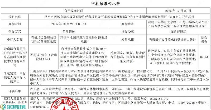 环卫科技网讯,10月29日,昆明市西郊有机垃圾处理特许经营项目及五华区低碳环保循环经济产业园废旧资源利用区(380亩)开发项目公布中标结果,云南清合蓝再生资源有限公司/北京高能时代环境技术股份有限公司联合体为中标人,有机垃圾处理项目特许经营期限不超过28年(含建设期1年)。