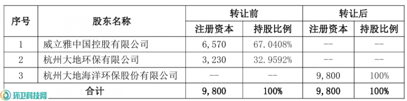 公告显示,基于公司整体战略布局及业务发展需要,优化公司产业布局,提高公司竞争优势,大地海洋拟与威立雅中国控股有限公司签订《股权转让协议》,拟以自有资金或自筹资金人民币4,000万元收购威立雅中国持有的标的公司67.0408%的股权,同时公司拟与杭州大地环保有限公司签订《股权收购协议》,拟以自有资金或自筹资金人民币1,966.52万元收购大地环保持有的威立雅杭州32.9592%的股权。