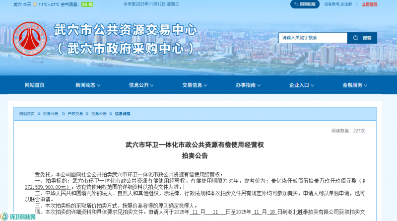环卫科技网讯,11月11日,武穴市综合行政执法局面向社会公开拍卖武穴市环卫一体化市政公共资源有偿使用经营权,有偿使用期限为30年,参考价为372,539,900.00元,约3.7亿元。