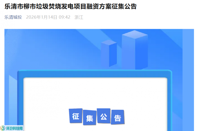 环卫科技网讯,1月14日,乐清城投集团下属子公司乐清市城投生态环保有限公司在 “乐清城投” 微信公众号发布《乐清市柳市垃圾焚烧发电项目融资方案征集公告》,核心内容如下: