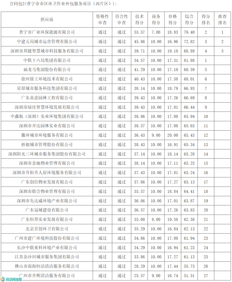 环卫科技网讯,据广东省政府采购网1月14日发布的《普宁市市区环卫作业外包服务项目(2026-2029年)结果公告》,28家企业参与竞标预算金额约2.4亿元的普宁市环卫外包项目,中铁十六局集团有限公司、普宁市广业环保能源有限公司在激烈竞争中胜出,各中的一标段。
