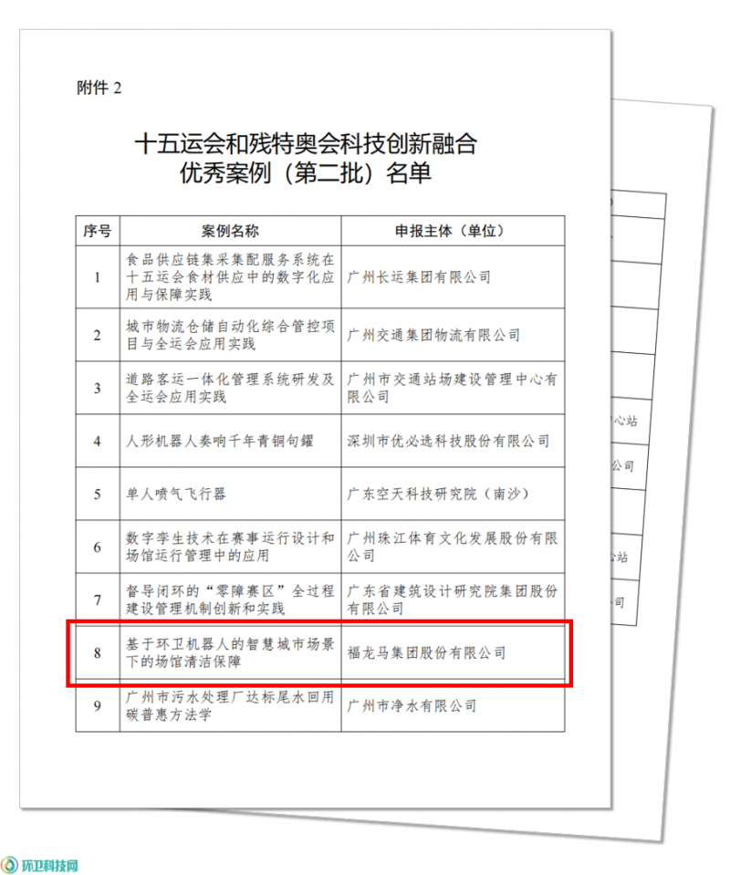 近日,广州市科学技术局正式公布“十五运会和残特奥会广州赛区科技创新融合优秀案例(第二批)”名单,由福龙马集团股份有限公司联合广州市城市管理技术研究中心(广州市生活垃圾分类管理事务中心)共同申报的“基于环卫机器人的智慧城市场景下的场馆清洁保障”项目成功入选。