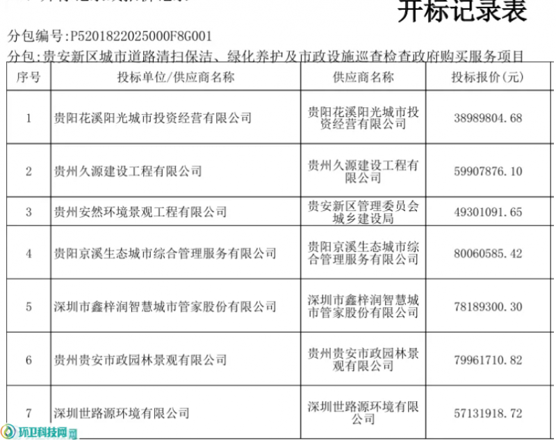 2026年1月9日,贵州省贵阳市贵安新区城市道路清扫保洁、绿化养护及市政设施巡查检查政府购买服务项目评审公示,7家单位参与竞标,最低报价38989804.68元,最高报价80060585.42元。其中,贵阳花溪阳光城市投资经营有限公司报价最低,为38989804.68元;贵州安然环境景观工程有限公司报价次低,为49302091.65元。