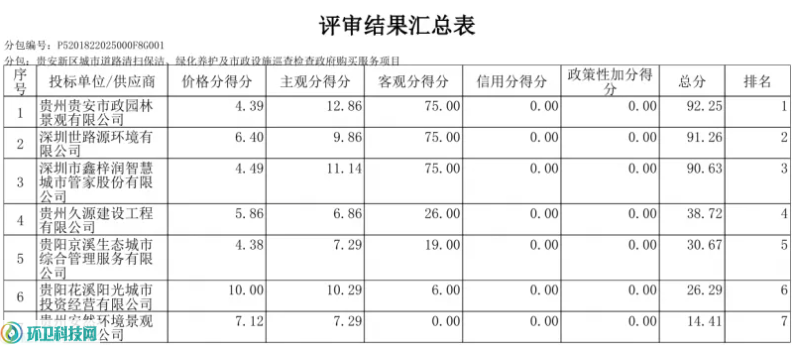 经过综合评判,贵州贵安市政园林景观有限公司、深圳世路源环境有限公司、深圳市鑫梓润智慧城市管家股份有限公司评审总分分列前三,被评为中标候选人。