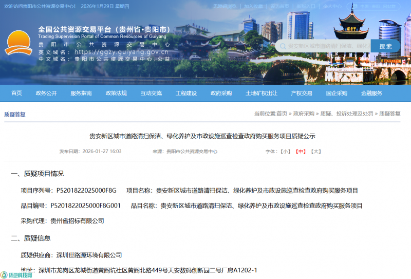 环卫科技网讯,1月27日,贵阳市公共资源交易中心发布《贵安新区城市道路清扫保洁、绿化养护及市政设施巡查检查政府购买服务项目质疑公示》,深圳世路源环境有限公司针对该项目提出两项质疑,直指贵阳花溪阳光城市投资经营有限公司、贵州安然环境景观工程有限公司和贵州贵安市政园林景观有限公司三家企业涉嫌通过提交异常低价的形式围标串标。