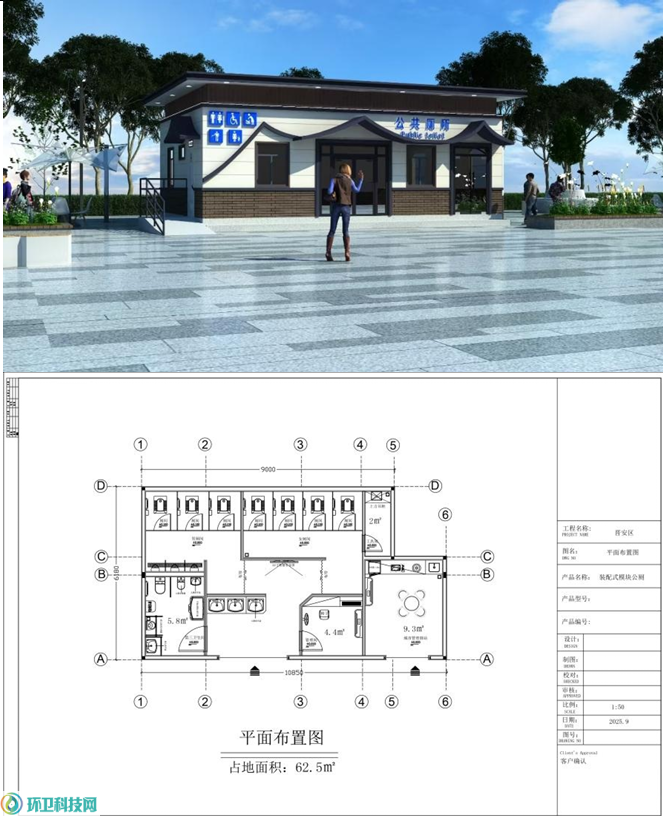本项目预算金额60万元,在福州市晋安区平原辖区内新建公厕1座,配设男厕间(蹲位数3个、小便位3个)、女厕间(蹲位数5个)、第三卫生间1个、工具间1个、管理间1个、大厅(盥洗区)、2个地面吹干机和独立城市管理驿站1座。总面积约60平方米。