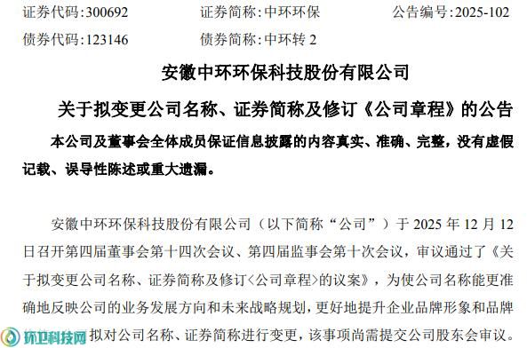 环卫科技网讯,12月12日,中环环保(300692)发布公告,宣布拟变更公司名称、证券简称并修订《公司章程》。