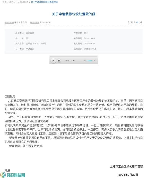 然而,上海市宝山区人民政府网站2024年10月9日公布了一份宝山区绿化市容局发给区财政局的《关于申请装修垃圾处置款的函》,“由于区财政经费紧张,处置款无法保证按期支付”,至2024年9月20日,“政府已累计拖欠处置款超过8千万元,使项目运营越发艰难”。
