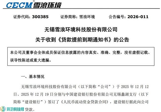 雪浪环境在公告中表示,公司于2025年12月12日、2025年12月19日分别与中国建设银行股份有限公司无锡蠡湖支行(以下简称“建设银行”)签订了《人民币流动资金贷款合同》,建设银行据此向公司发放了贷款。