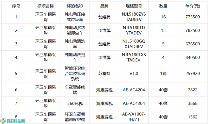 该项目总预算金额4635.52万元,分为三个包进行采购,分别是包一:环卫设备采购(购置压缩设备25台);包二:环卫车辆采购(购置纯电动压缩式垃圾车16辆、纯电动多功能抑尘车15辆、纯电动清洗车5辆、纯电动洗扫车4辆、智能环卫综合监控管理系统1套、车载智能终端40套、360环视40套、环卫车载智能调度终端40套);包三:环卫设施采购(更新移动公厕10座。垃圾收集设施:垃圾分类桶300组、垃圾分类亭20个、果皮箱1104个)。