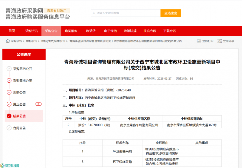 环卫科技网讯,1月27日,西宁市城北区市政环卫设施更新项目发布中标结果公告,包一、包三“投标供应商数量不符合要求,系统自动废标”,包二则由南京金龙客车制造有限公司以3167万元的报价中标。