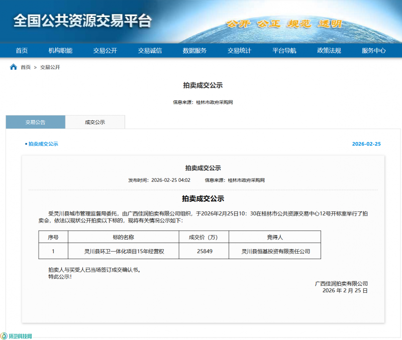 环卫科技网从全国公共资源交易平台获悉,2月25日, 灵川县环卫一体化项目15年经营权以公开拍卖的方式成交,竞得人为灵川县恒基投资有限责任公司,成交价25849万元。