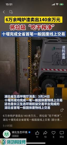 环卫科技网3月26日从“湖北生态环境”视频号获悉,3月24日,十堰市成功完成一笔一般固体废物线上交易,将6万余吨垃圾焚烧炉渣卖出140余万元,这是长江生态环境权益交易平台完成的湖北省首笔一般固体废物线上交易。