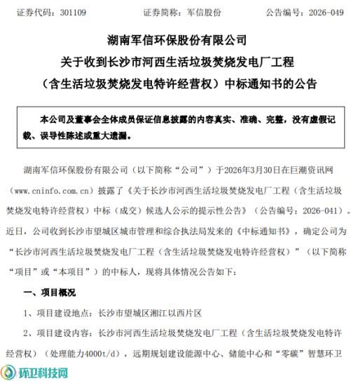 环卫科技网讯,4月17日,军信股份(301109)发布公告,宣布已收到长沙市河西生活垃圾焚烧发电厂工程(含生活垃圾焚烧发电特许经营权)中标通知书,项目处理能力为4000t/d,中标价99元/吨。