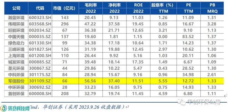 核心盈利因子全行业领先,低估值高股息防御性出众。1)盈利因子层面:公司项目地处中部省会城市长沙(人口净流入、垃圾热值高、政府财政健康)具有区域竞争优势。公司焚烧项目吨垃圾上网电量400度+、垃圾处理费109.9元/吨均高于行业平均水平。2022年公司毛利率57%、净利率30%亦领先光大、三峰、绿动、瀚蓝等同行业上市公司。2)分红层面:公司目前仅剩平江和浏阳合计1800吨/日的产能尚待投运,资本开支的高峰期已过,23H1自由现金流转正且达7.02亿元,货币资金及交易性金融资产与未分配利润分别高达19.71亿元和17.96亿元,为后续可实现高分红政策打下了坚实基础。2022年公司的股利支付率79%,当前股价股息率5.55%(2023.9.26收盘价)。