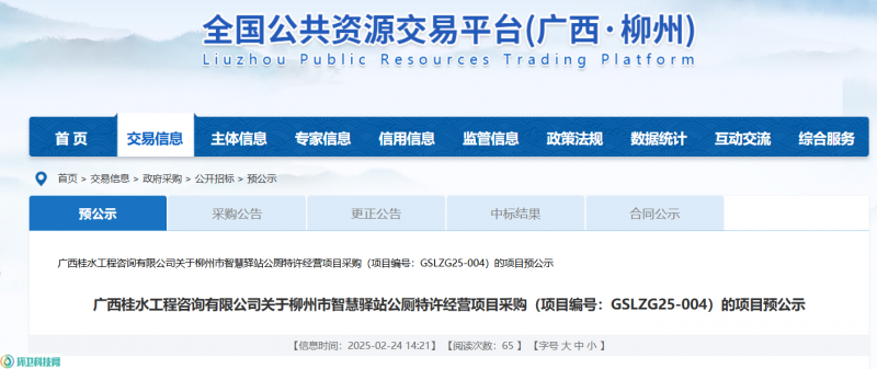 我单位受采购人(柳州市城市管理局)委托,拟对柳州市智慧驿站公厕特许经营项目采购(项目编号:GSLZG25-004)项目进行公开招标采购,为了保障采购各方当事人合法权益,现对本项目的供应商资格条件要求、采购需求、评标办法及评分标准的内容(详见附件)予以预公示。所有潜在投标人或采购评审专家若认为本项目上述要求存在唯一性或排他性等问题,请于2025年2月26日下午17时30分前以书面形式(意见函须加盖公章)向我单位反映,以便我单位完善采购文件。如供应商需要提交意见函,请携带贵单位营业执照副本复印件(加盖公章,一份)、经办人身份证原件及复印件(加盖公章,一份)、提交意见函原件。意见函应注明联系人和联系方式。