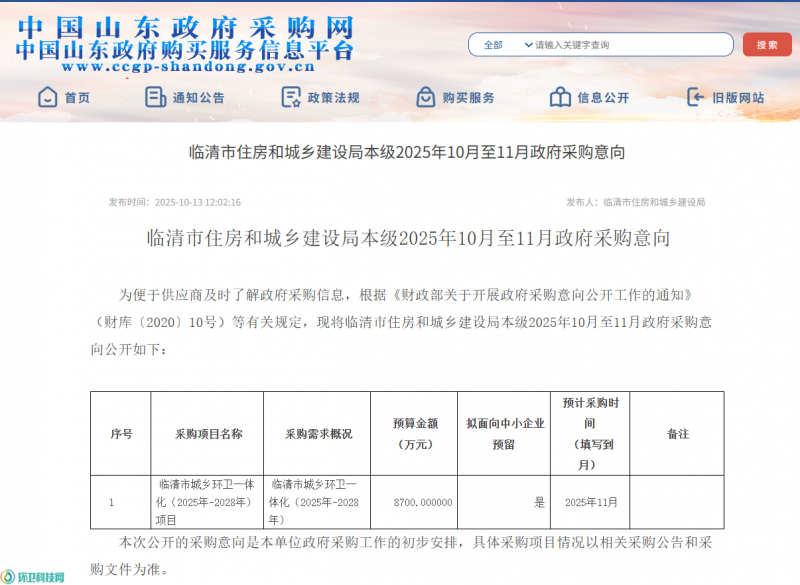 环卫科技网讯,10月13日,临清市住房和城乡建设局发布了“临清市城乡环卫一体化(2025年-2028年)项目”采购意向,预算金额8700万元。