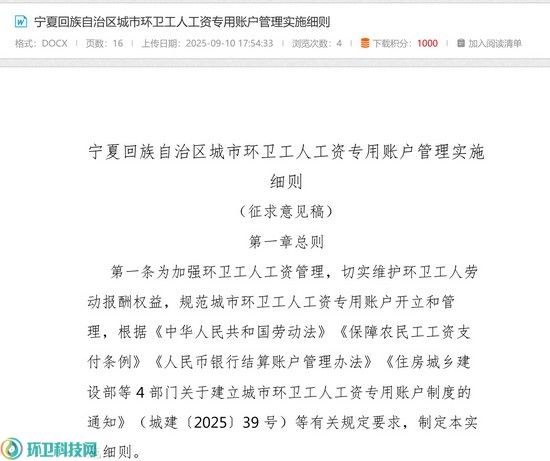 另外,环卫科技网还在某文档分享平台上检索到《宁夏回族自治区城市环卫工人工资专用账户管理实施细则(征求意见稿)》(以下简称《细则》)全文,上传日期为2025年9月10日。《细则》第一章第一条中提到“为加强环卫工人工资管理,切实维护环卫工人劳动报酬权益,规范城市环卫工人工资专用账户开立和管理,根据……《住房城乡建设部等4部门关于建立城市环卫工人工资专用账户制度的通知》(城建〔2025〕39号)等有关规定要求,制定本实施细则”。