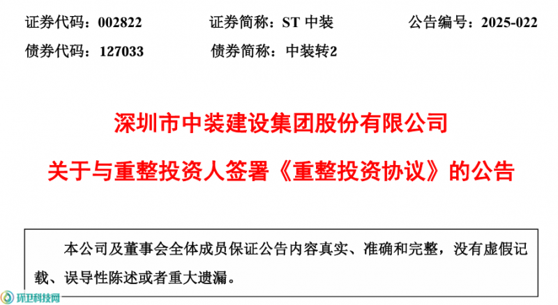 2025年3月,中装建设与上海恒涔企业管理咨询有限公司、上海康恒环境股份有限公司签署《重整投资协议》。
