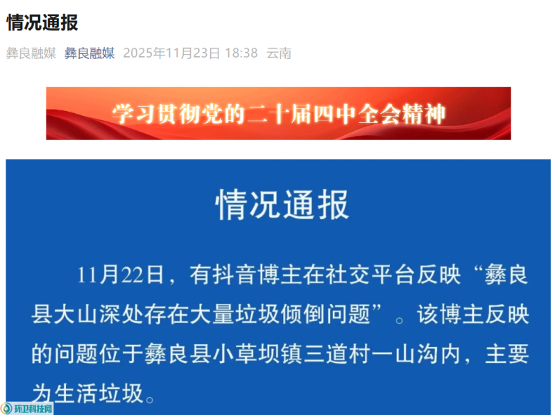 环卫科技网讯,11月23日,针对网络上热议的“彝良县大山深处存在大量垃圾倾倒问题”,云南昭通市生态环境局彝良分局发布情况通报。