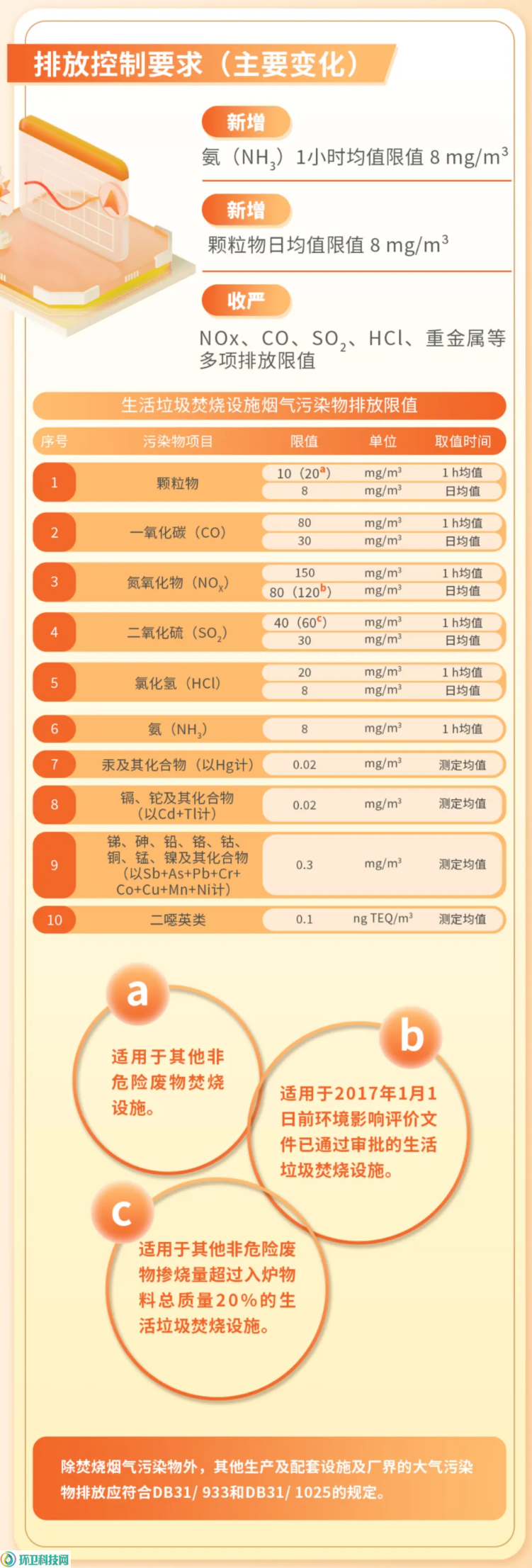限值方面,与修订前相比,收严了一氧化碳、氮氧化物、二氧化硫、氯化氢的日均浓度值和小时浓度均值及重金属类的测定均值。其中,考虑到部分早期建设的生活垃圾焚烧线缺少烟气脱硝改造场地,对2017年1月1日前投运的焚烧设施规定了适度宽松的氮氧化物日均值。考虑到部分焚烧设施需要承担一般工业固废协同处置任务,对掺烧一般工业固废量超过20%的焚烧设施规定了适度宽松的二氧化硫小时浓度均值。