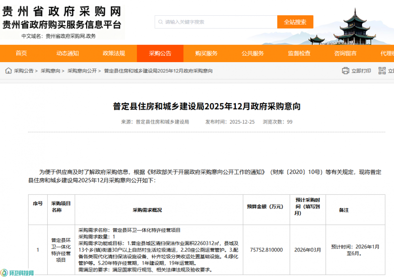 环卫科技网讯,12月25日,普定县住房和城乡建设局发布了“普定县环卫一体化特许经营项目”政府采购意向,采购预算75752.81万元。