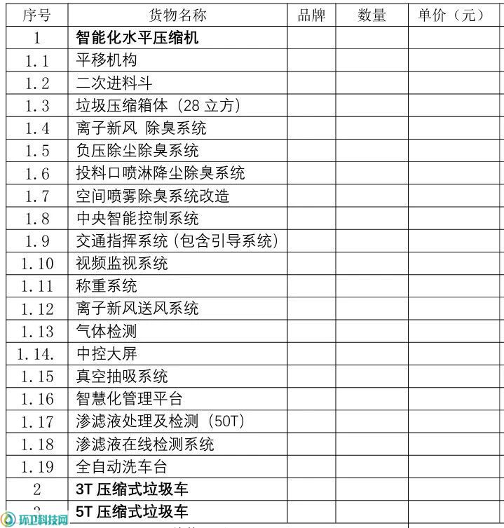 日前,为提升城市环境卫生作业效率与服务水平,潍坊潍州市政工程有限公司对智能化地上水平压缩转运设备、3吨压缩垃圾车5辆、5吨垃圾压缩车5辆进行采购。该招标项目为交钥匙项目,到货、组装、安装、调试完成达到使用条件,预算5613万元。
