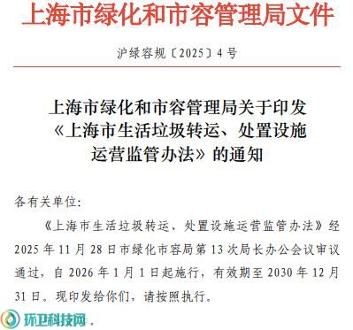 环卫科技网讯,上海市绿化市容局近日印发《上海市生活垃圾转运、处置设施运营监管办法》(沪绿容规〔2025〕4号),《监管办法》将自2026年1月1日起施行,有效期至2030年12月31日。