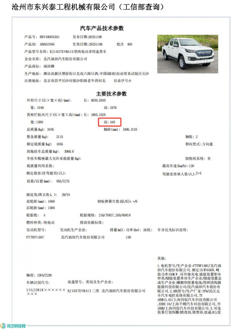沧州市东兴泰工程机械有限公司所投环卫巡查车车型福田牌:BJ1037EVMA15型纯电动多用途货车,投标文件中填写货箱尺寸(长×宽×高)≥1805×1580×450mm,经核实,工业和信息化部装备工业发展中心网站发布的货箱尺寸(长×宽×高)1805,1520×1580×440mm,沧州市东兴泰工程机械有限公司所投环卫巡查车不满足招标文件中要求(工业和信息化部装备工业发展中心网站查询数据)第四部分(二)参数要求环卫巡查车中参数中的*10。