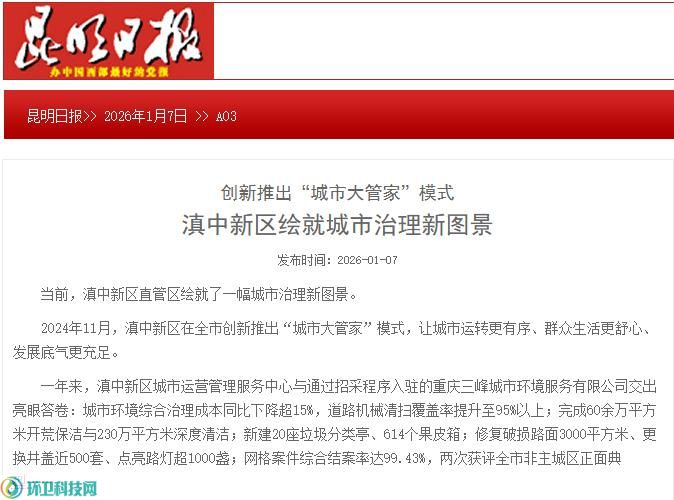 实力刷屏!《昆明日报》近日专题报道云南滇中新区城市大管家项目。报道高度认可了该项目的创新做法与运行成效,生动展现其示范价值。