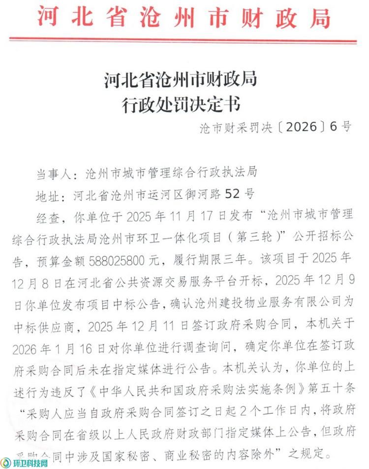 处罚决定书显示,“经查,你单位于2025年11月17日发布“沧州市城市管理综合行政执法局沧州市环卫一体化项目(第三轮)”公开招标公告,预算金额588025800元,履行期限三年。该项目于2025年12月8日在河北省公共资源交易服务平台开标,2025年12月9日你单位发布项目中标公告,确认沧州建投物业服务有限公司为中标供应商,2025年12月11日签订政府采购合同,本机关于2026年1月16日对你单位进行调查询问,确定你单位在签订政府采购合同后未在指定媒体进行公告。本机关认为,你单位的上述行为违反了《中华人民共和国政府采购法实施条例》第五十条“采购人应当自政府采购合同签订之日起2个工作日内,将政府采购合同在省级以上人民政府财政部门指定媒体上公告,但政府采购合同中涉及国家秘密、商业秘密的内容除外”之规定。”