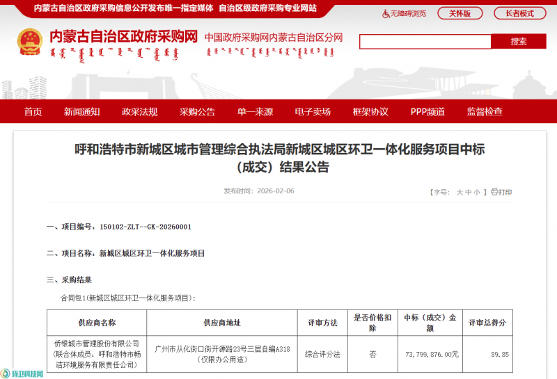 环卫科技网2月6日从内蒙古自治区政府采购网获悉,侨银城市管理股份有限公司作为联合体牵头人(成员方:呼和浩特市畅洁环境服务有限责任公司)中标了呼和浩特新城区城区环卫一体化服务项目,中标金额7379.9876万元/年。
