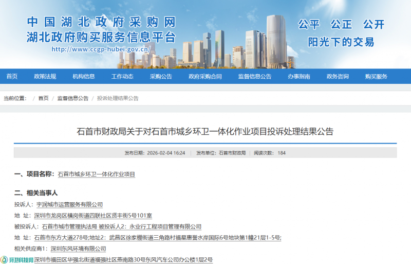 据了解,石首市城乡环卫一体化作业项目于2025年12月8日发布招标公告,2025年12月29日发布中标公告,深圳东风环境有限公司中标了该项目,中标金额28443.324150万元。
