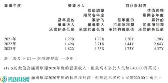 据悉,收购协议包含了“对赌”条款,卖方及范满国承诺满国康洁2021-2023年当年度的营业收入承诺的最低值分别为1.22X(“X”为满国康洁2020年的营收额,不高于24亿元,下同)、1.49X、1.82X,估值调整期间各年度累计的营业收入承诺的最低值为1.22X、2.71X、4.53X。同期,在扣非净利润承诺,当年度的扣非净利润承诺的最低值为1.20Y(“Y”为满国康洁2020年度的扣非净利润,不高于2.2亿元)、1.44Y、1.73Y;估值调整期间各年度累计的扣非净利润承诺的最低值分别为1.20Y、2.64Y、4.37Y。