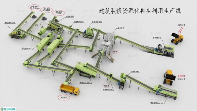建筑垃圾成分杂、体积大,传统处理效率低、分选精度差、附加值低。政策鼓励破碎- 分选 - 再生一体化,推动再生骨料、再生燃料、再生制品高值化利用,企业纷纷推出高效、集约、定制化装备方案。
