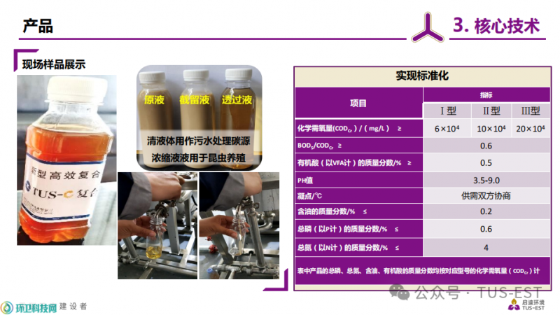 针对这一行业痛点,启迪环境研发出餐厨垃圾制备新型生物质碳源核心技术,依托水解酸化发酵工艺,将餐厨垃圾中丰富的有机质转化为富含乙酸、乳酸的高值生物质碳源,攻克了传统工艺的诸多难题:发酵周期缩短至 2-8 天,工艺简单易运维,还能实现多元生物基产品输出,清液作为污水处理碳源,浓缩液用于昆虫养殖,真正实现 “变废为宝”。