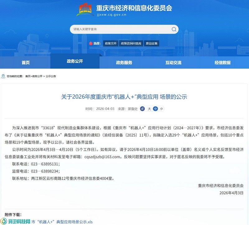 环卫科技网讯,4月3日,为深入推进重庆市“33618”现代制造业集群体系建设,根据《重庆市“机器人+”应用行动计划(2024—2027年)》要求,重庆市经济信息委对包括“机器人+高校校园智能清扫环卫场景”在内的29个“机器人+”应用场景予以公示。