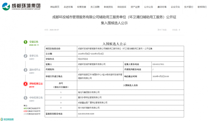 环卫科技网讯,4月7日,成都环投城市管理服务有限公司辅助用工服务单位(环卫清扫辅助用工服务)公开征集入围候选人公示,福龙马集团股份有限公司、重庆多泰物业管理有限公司、成都鑫金居广厦物业管理有限公司和绿大地环境服务有限公司4企入围。