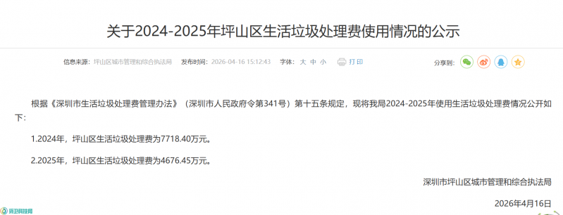 环卫科技网讯,4月16日,深圳市坪山区城市管理和综合执法局发布《关于2024-2025年坪山区生活垃圾处理费使用情况的公示》。2024年和2025年,坪山区生活垃圾处理费分别为7718.40万元和4676.45万元。