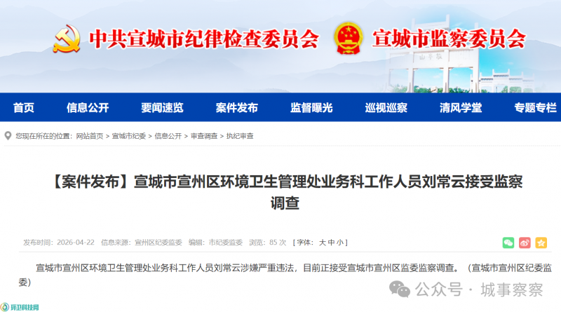宣城市宣州区环境卫生管理处业务科工作人员刘常云涉嫌严重违法,目前正接受宣城市宣州区监委监察调查。