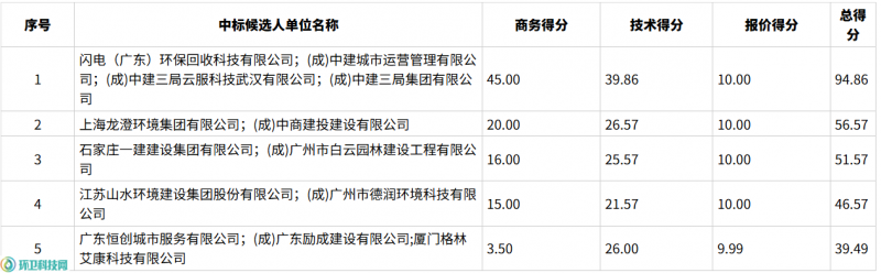 根据评标结果,闪电(广东)环保回收科技有限公司、中建城市运营管理有限公司、中建三局云服科技武汉有限公司、中建三局集团有限公司组成的联合体成为第一中标候选人,预中标该项目。
