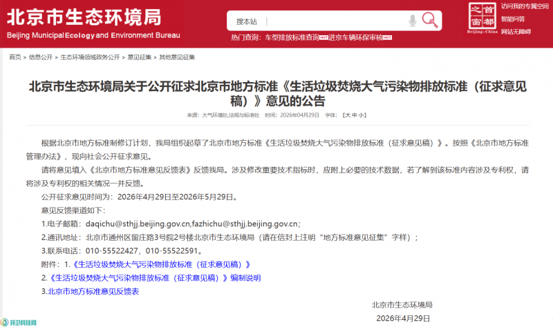 环卫科技网讯,4月29日,北京市生态环境局发布关于公开征求北京市地方标准《生活垃圾焚烧大气污染物排放标准(征求意见稿)》意见的公告。本标准充分考虑首都生态环境定位和京津冀协同治污需求,排放限值设定严于国家标准,关键指标达到国内先进水平。