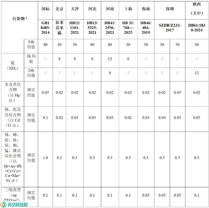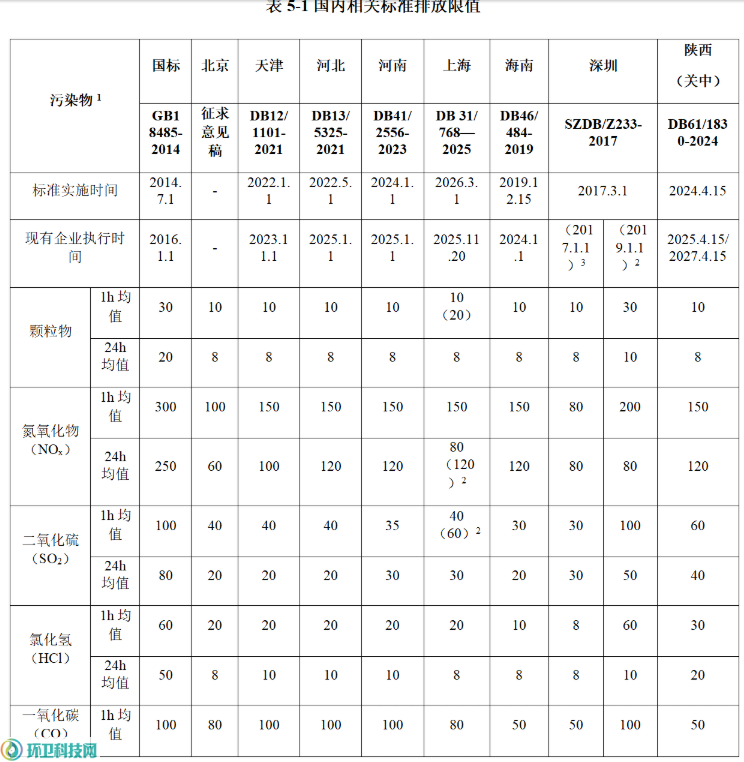 本标准核心污染物的日均值、小时均值及特征污染物测定均值限值综合考虑技术性可行、大气环境质量改善目标、京津冀协同治污要求等方面进行设定,较国家标准进行了收严。其中颗粒物限值设定严于国标,与河北、天津地方标准持平;SO2限值严于国标,与河北、天津地方标准一致,略严于上海标准;NOₓ限值显著严于国标,严于河北、天津地方标准;CO限值严于国标和河北、天津地方标准;HCl限值参考上海市地标,远低于国标限值;NH3限值参考河北、天津地方标准,结合北京市企业氨逃逸控制技术水平,设定小时均值8mg/m³;汞及其化合物限值0.02mg/m³,严于国标,与多数地方标准持平;镉及其化合物限值0.02mg/m³,严于国标;八种重金属化合物总量限值0.3mg/m³,严于国标,与河北、天津地方标准一致;二噁英类限值保持与国标及河北、天津地方标准持平。