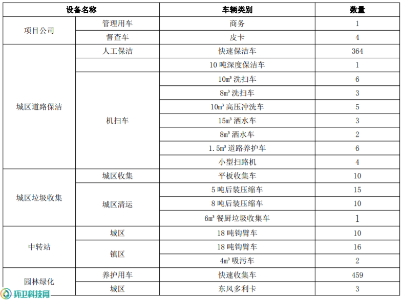 根据招标文件要求,中标公司须与市政府指定的国有公司组建新公司作为实施主体,统一对城区环卫保洁、垃圾清运、厨余垃圾运输、公厕及垃圾转运站管理、绿化管理等进行打包管理,中标公司占股90%,须出资900万元作为成立新公司的启动资本金,国有公司占股10%,出资100万。合作公司成立后设备最低配置要求如下: