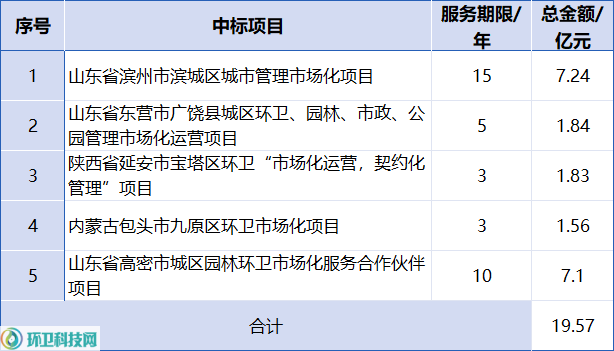 截止到今日,玉禾田全年已中标5个亿级环卫项目,合计总中标金额达19.57亿。