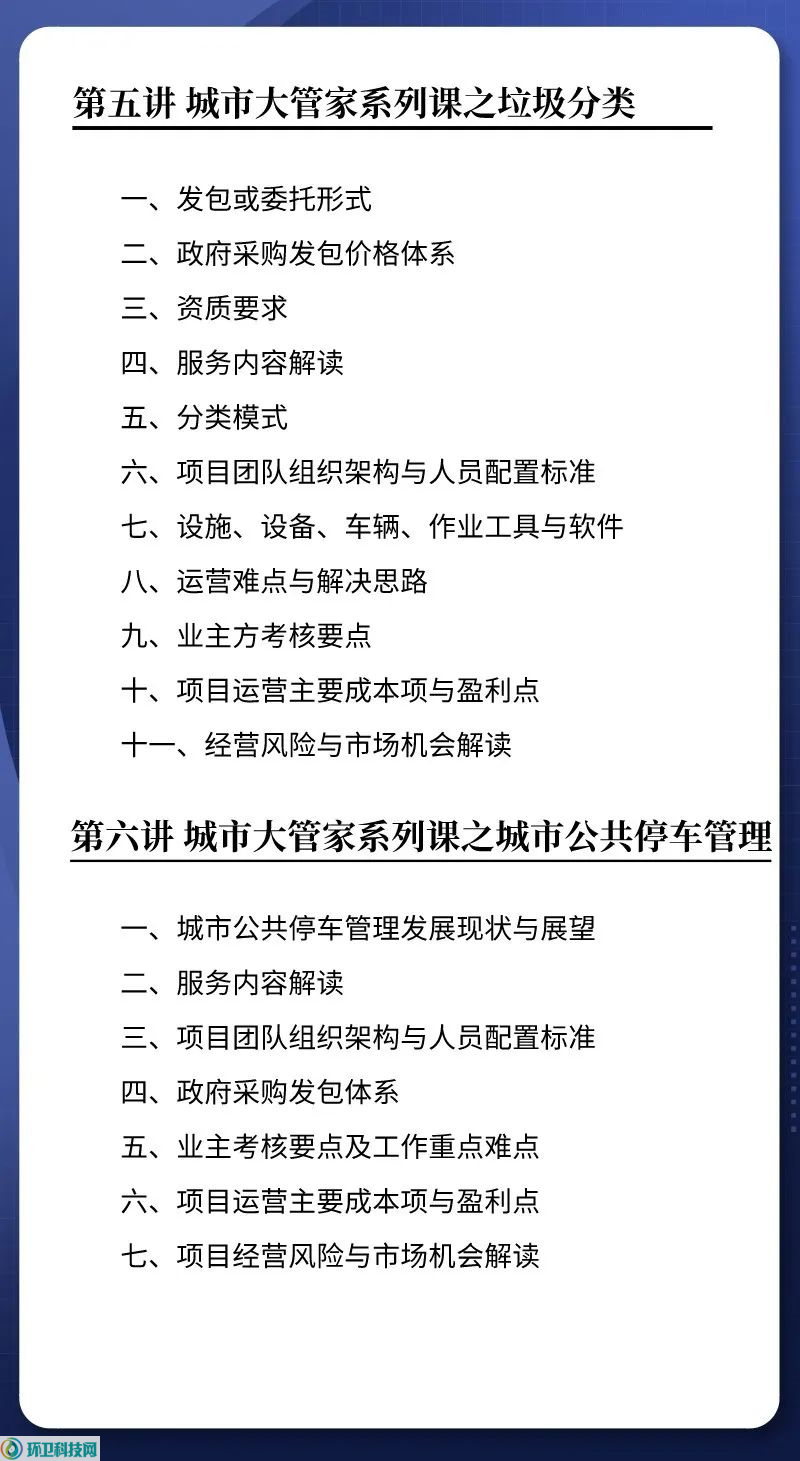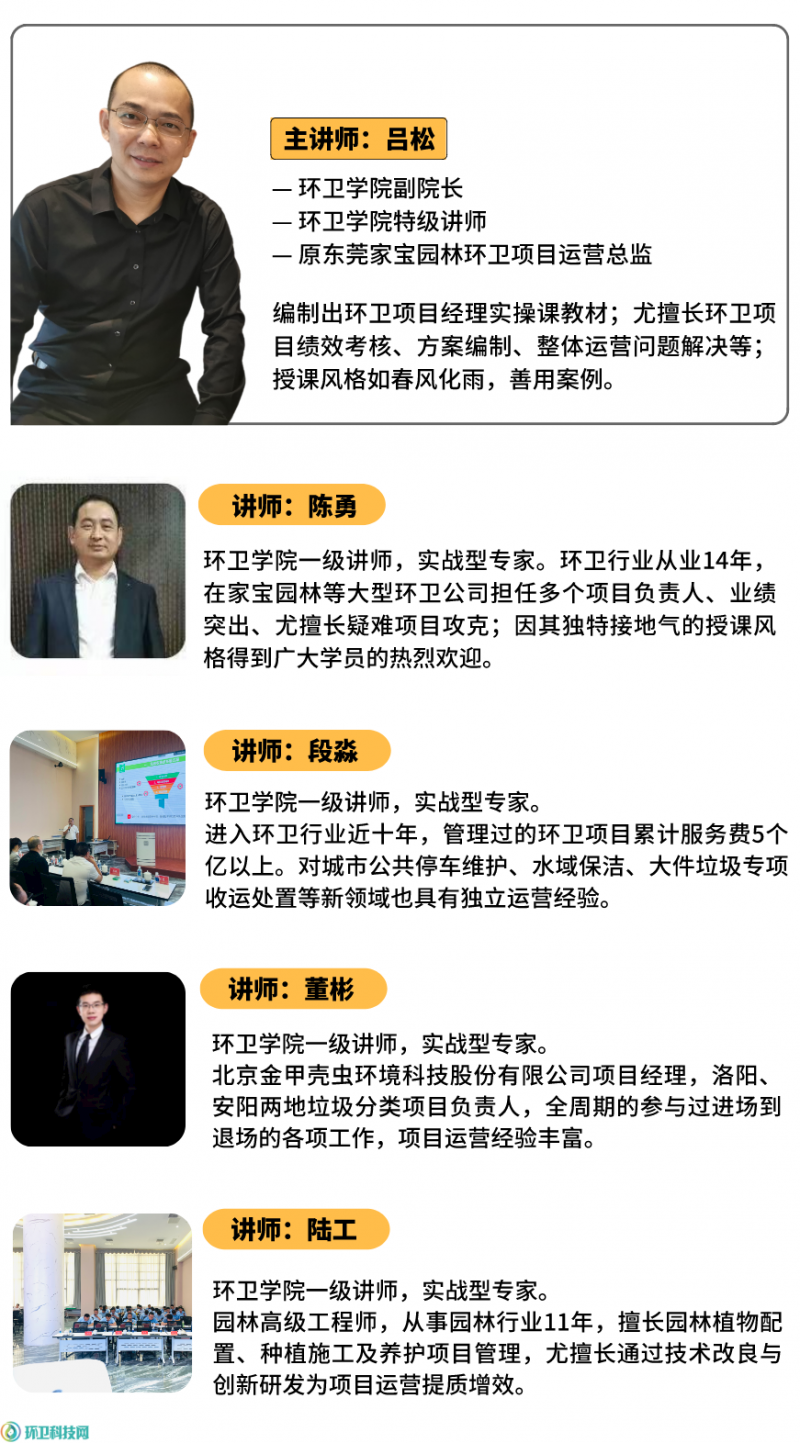 本次课程的讲师共7名,阵容非常强大。他们都是来自环卫项目、垃圾分类、园林绿化、水域保洁等各领域的资深运营管理者,不仅掌握着丰富的案例经验,还很熟悉当前的行业趋势。