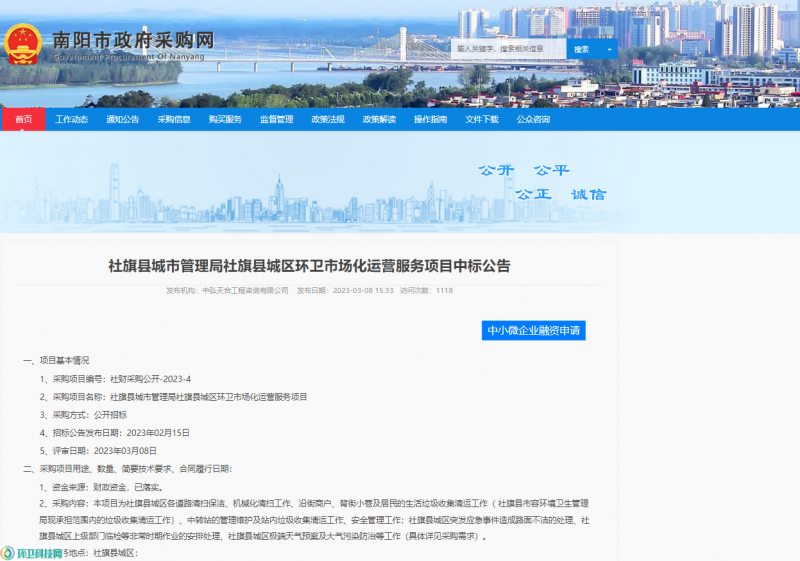 环卫科技网讯,3月8日,南阳市政府采购网发布社旗县城区环卫市场化运营服务项目中标公告,清尘环保技术有限公司中标该项目,中标金额21,262,979.35元/年,服务时间3+2年,预估项目总额1.06亿元。