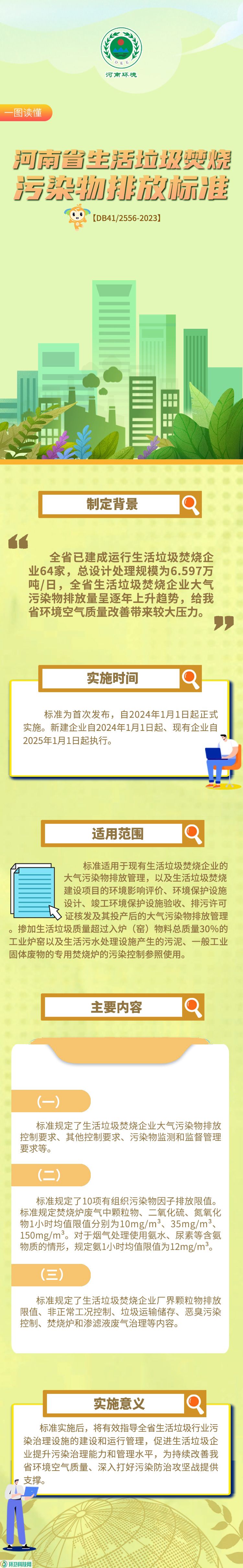 《生活垃圾焚烧大气污染物排放标准》(DB41/2556-2023)适用于现有生活垃圾焚烧企业的大气污染物排放管理,以及生活垃圾焚烧建设项目的环境影响评价、环境保护设施设计、竣工环境保护设施验收、排污许可证核发及其投产后的大气污染物排放管理。标准规定了生活垃圾焚烧炉烟气中颗粒物、二氧化硫、氮氧化物、氯化氢、一氧化碳、氨等污染物的排放限值,焚烧炉废气中颗粒物、二氧化硫、氮氧化物浓度限值分别为10毫克/立方米、35毫克/立方米、150毫克/立方米。标准对非正常工况控制、垃圾运输储存、恶臭污染控制、烟气治理、污染物监测等进行了规定。