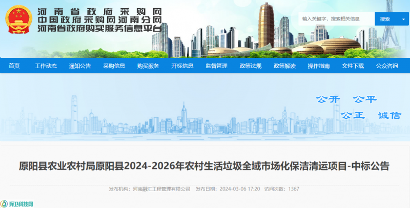 环卫科技网讯,3月6日,原阳县2024-2026年农村生活垃圾全域市场化保洁清运项目开标,项目共两个包,分别由清尘环保技术股份有限公司、河南明亮城市服务科技有限公司中标,中标总金额45925202元。